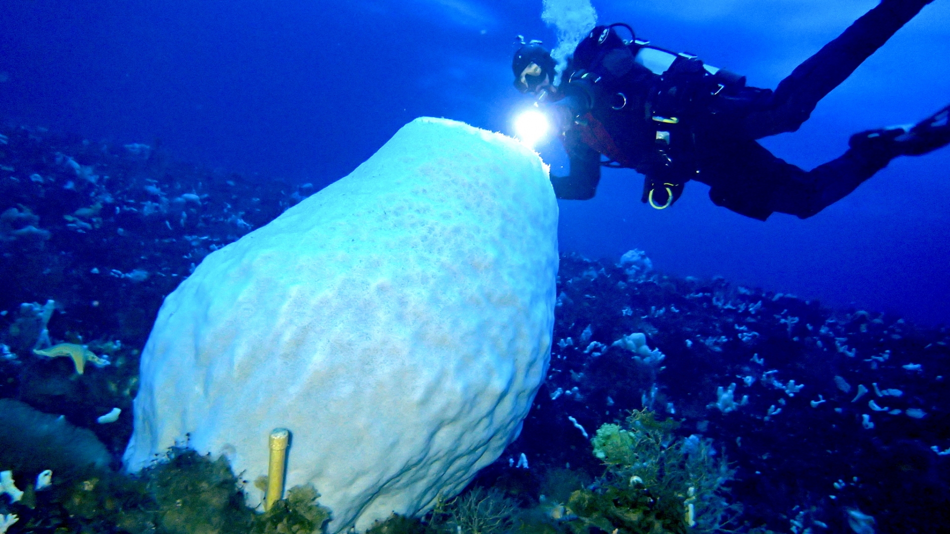 Bei dem Riesenschwamm tickt die Lebensuhr offenbar extrem langsam: Er hat womöglich den langsamsten Stoffwechsel aller Tierarten, was sich unter anderem an seinem Wachstum zeigt – unter bestimmten Bedingungen legt der Schwamm innerhalb mehrerer Jahrzehnte überhaupt nicht an Körpergröße zu.