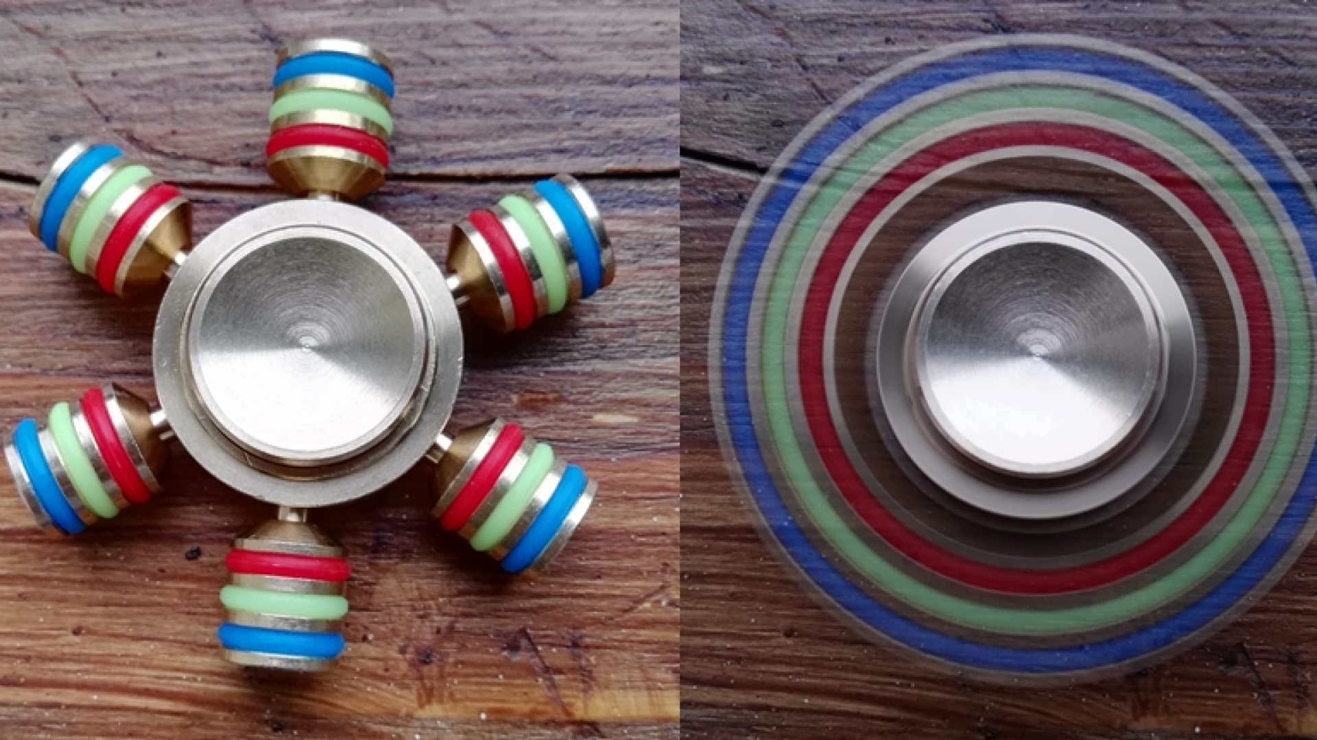 Im Prinzip ist der kleine Handkreisel simpel aufgebaut: Er besteht aus einem Kugellager in der Mitte, das es erlaubt, den Kreisel zu drehen und trotzdem festzuhalten. An diesem sind seitliche Arme aus Plastik und Metall angebracht, die jeweils nach außen hin breiter werden und eine Art Griffloch besitzen. Inzwischen gibt es von diesem Grundbauplan unzählige Varianten – mit nur zwei Armen, aus verschiedensten Materialien und in ganz unterschiedlichen Farben.