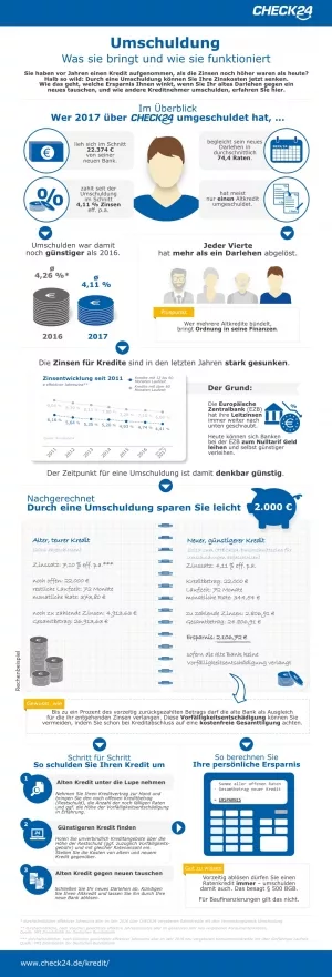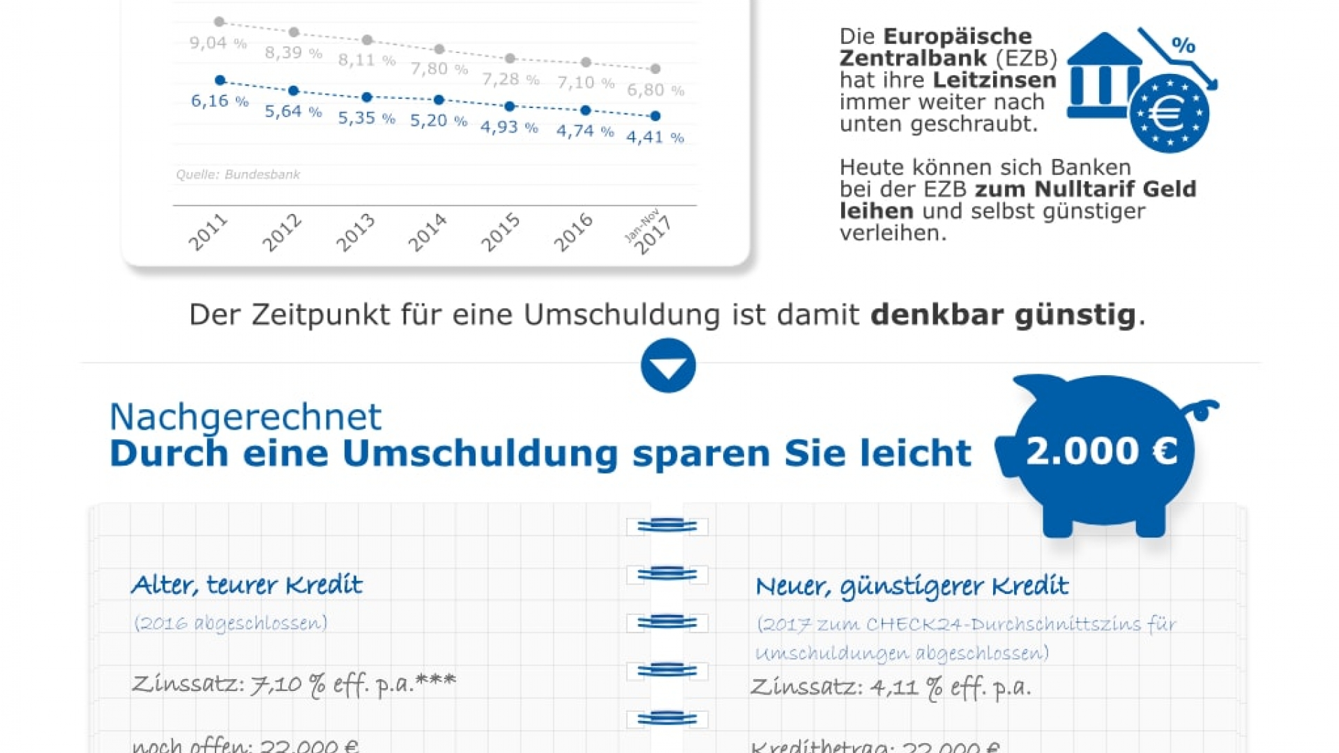 Auch, wenn die Umschuldungsersparnis individuell verschieden ist, so kann doch ein Beispiel verdeutlichen, wie viel der Tausch von einem alten gegen einen neuen Kredit bringt. Das Vergleichsportal CHECK24 hat dazu eine Berechnung aufgestellt und sich dabei an seinem durchschnittlichen Umschuldungskunden des vergangenen Jahres orientiert.