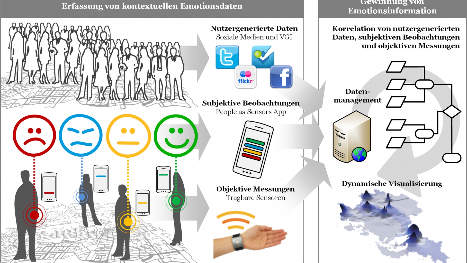 Um solche problematischen Ort zu identifizieren, haben Wissenschaftler der Universitäten Heidelberg und Kaiserslautern nun ein ungewöhnliches Projekt gestartet: Nach dem Prinzip „People as Sensors“ nutzen sie die Emotionen ganz normaler Stadtbewohner, um die Stellen in der Stadt zu finden, die negative Gefühle hervorrufen. Die Daten sollen zeigen, wie Bürger ihre Stadt nutzen, wo sie sich wohlfühlen und durch welche Gegebenheiten problematische Situationen entstehen können.