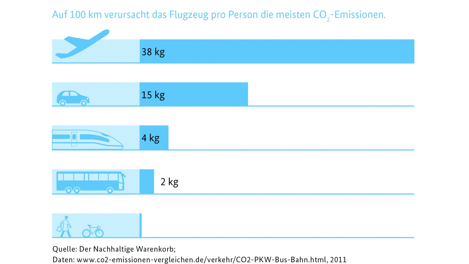 Auf 100 Kilometer verursacht das Flugzeug pro Person die meisten CO2-Emmissionen.
