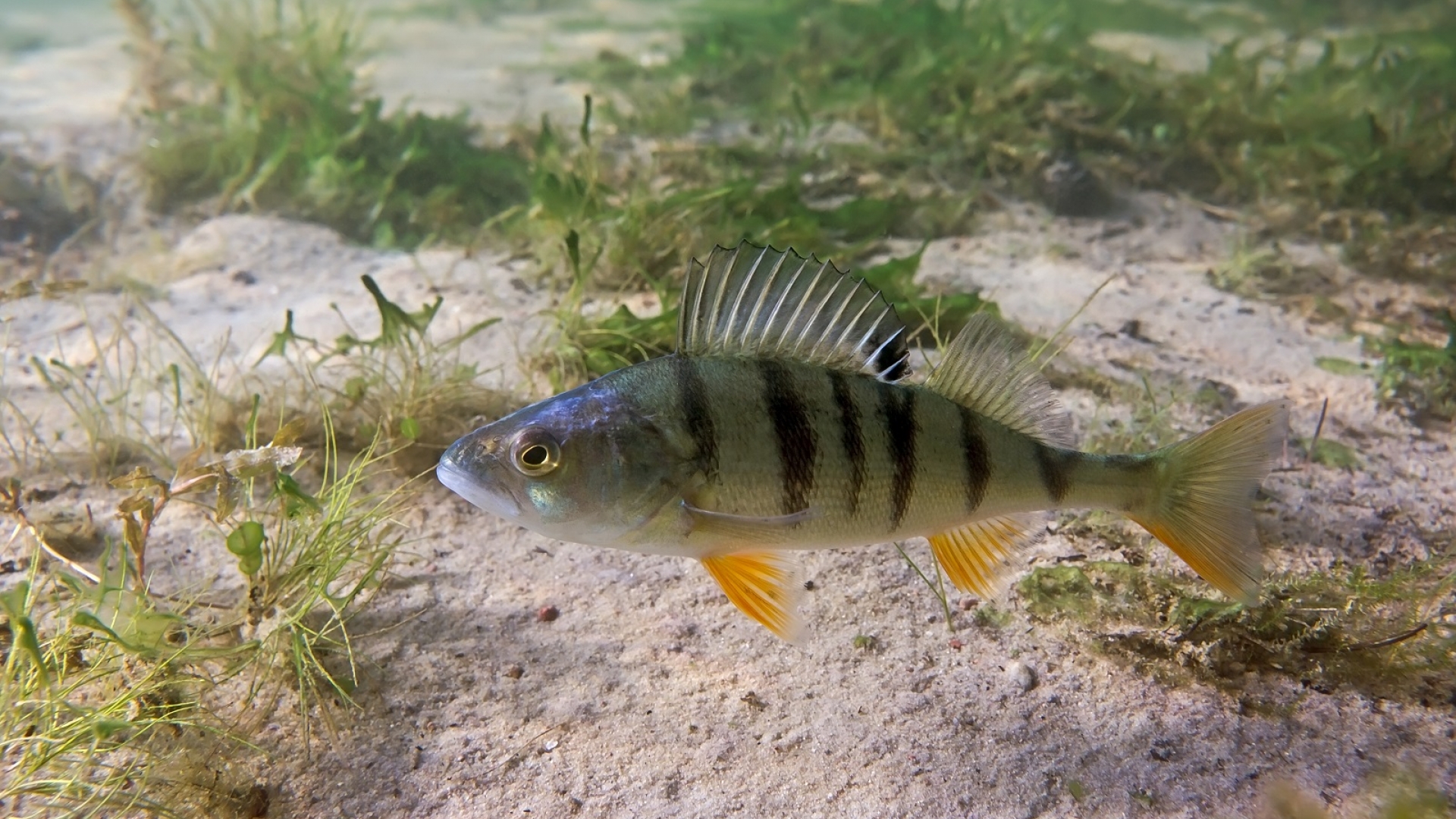 Einer der Hauptverdächtigen, wenn man eine ungewöhnliche Berührung am Bein spürt, ist meist ein Fisch. Zu Recht, denn obwohl die meisten Fische scheu sind, gibt es auch Arten, die sich im flachen Wasser aufhalten und sich auch von zahlreichen Badegästen nicht stören lassen. Das trifft zum Beispiel auf den Flussbarsch zu. Man erkennt ihn gut an seinen schwarzen Streifen und rötlichen Flossen. Aber auch andere Arten wie Plötzen und Rotfedern, die ebenfalls rötliche Flossen und silbergraue Schuppen haben, trauen sich recht nah an unsere Füße heran. In größeren Seen kann man auch Ukeleis beobachten, die Insekten von der Wasseroberfläche fressen.