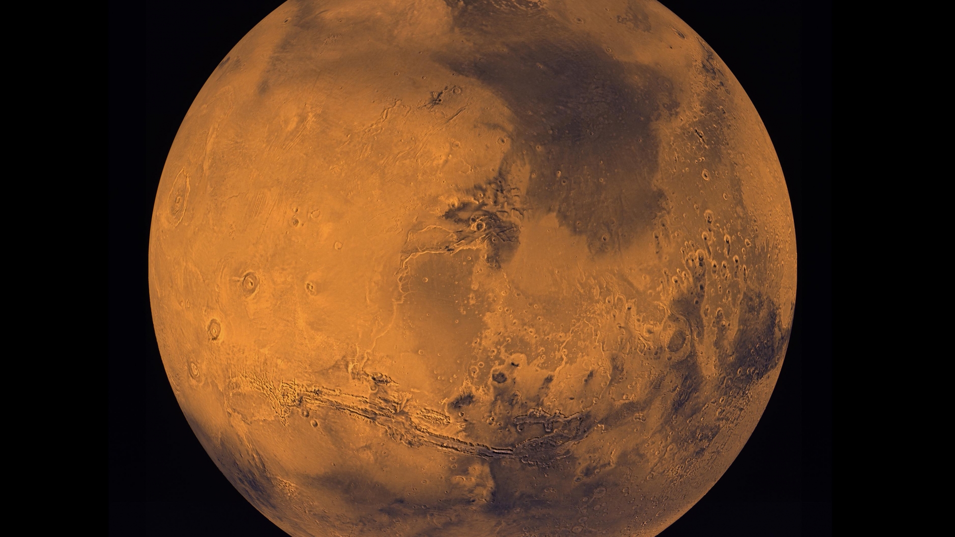Dieser Marsglobus wurde 1976 aus Aufnahmen der Viking-Obitersonden zusammengesetzt.