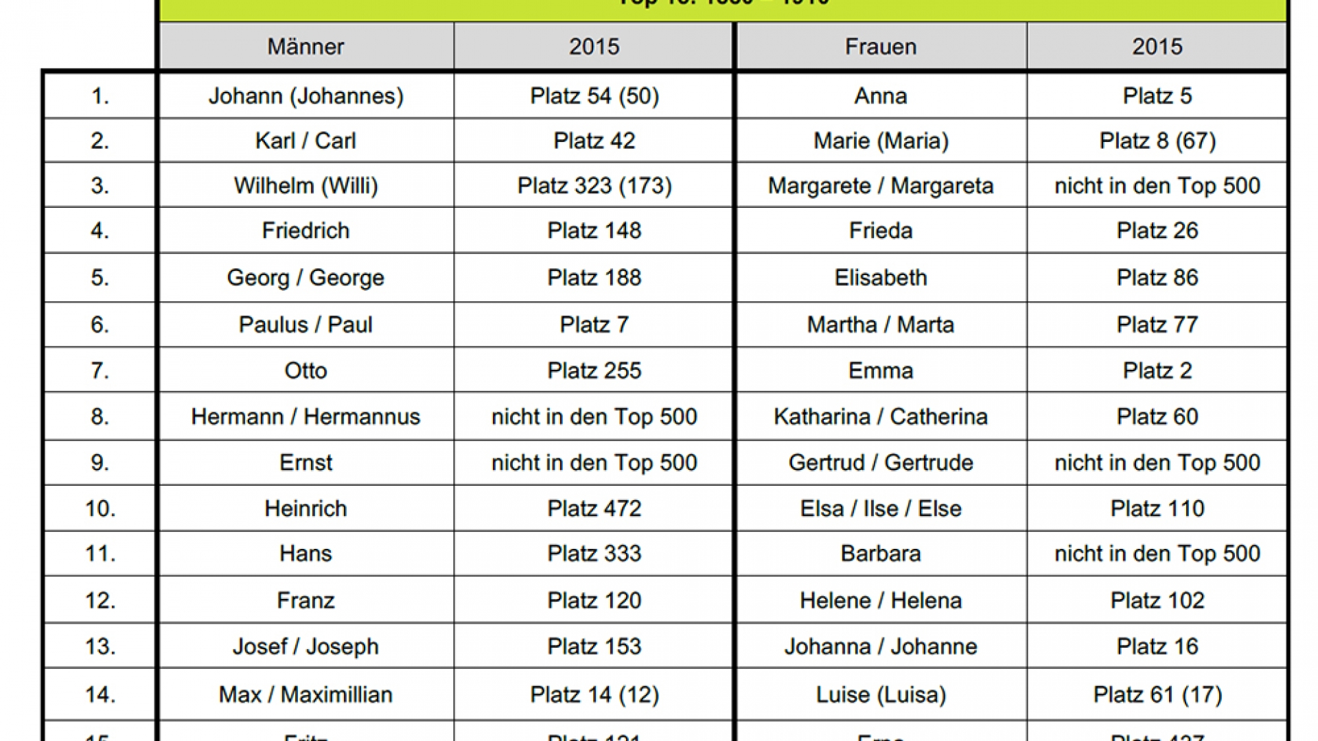 Das Ergebnis: Einige der noch vor hundert Jahren beliebtesten Namen gibt es heute kaum noch. So war der Vorname Wilhelm beispielsweise gegen Ende des 19. Jahrhunderts einer der angesagtesten deutschen Männernamen. Auch Hans, Ernst, Walter, Erich, Rudolf, Eugen, Bernhard oder Herbert waren damals sehr verbreitet. Betrachtet man aber die aktuelle Namensrangliste von 2015, so finden sich Wilhelm und Hans nur noch auf Platz 323 und 333. Die restlichen sind nicht einmal mehr in den Top 500 vertreten.
