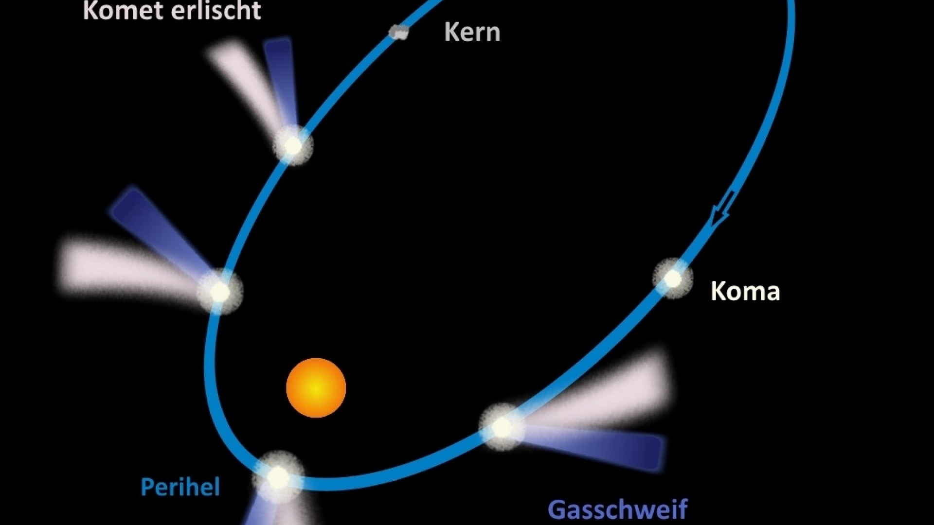 Wenig später bildet sich auch der Schweif, der den Kometen den Beinahmen "Schweifstern" eingebracht hat. Da der Gasschweif vom Sonnenwind geformt wird, bildet er sich immer auf der sonnenabgewandten Seite des Kometen und ist in der Regel gerade. Manchmal bildet ein Komet aber auch einen zweiten, stärker gekrümmten Schweif. Er entsteht durch kleine ungeladene Staubteilchen, die durch den Strahlungsdruck des Sonnenwindes aus der Koma geblasen werden.