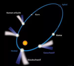 Das aber ändert sich, wenn der Komet sich der Sonne und dem inneren Sonnensystem annähert. Die zunehmende Sonneneinstrahlung und Wärme lässt ihn dann allmählich erwachen – er wird aktiv. Dabei beginnt die äußere Eisschicht, vom gefrorenen in den gasförmigen Zustand zu wechseln. Diese Ausgasung reißt Staubkörnchen von der Kometenoberfläche mit ins All hinaus. Gas und Staub bilden die Kometenhülle, die den "Kopf" des Kometen durch reflektiertes Sonnenlicht aufleuchten lässt.