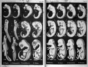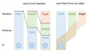 Haeckels biogenetisches Grundgesetz besagt, dass bei Wirbeltieren jeder Embryo oder jede Larve in den ersten Wochen der körperlichen Entwicklung die gesamte stammesgeschichtliche Entwicklung der eigenen Tiergruppe im Schnelldurchgang durchlebt. Er sah das Heranwachsen jedes Embryos als kurzes Abbild der Evolution der jeweiligen Tierart.