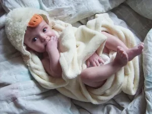 Für andere Hautpartien wie Gesicht und Hände genügt in der Regel klares Wasser, bei Bedarf mit einem kleinen Schuss rückfettendem Waschgel. Gründlichkeit ist aber auch hier gefragt. So verstecken sich manchmal Milchreste in den Halsfalten, die entfernt werden müssen. Aus hygienischen Gründen sollte der Waschlappen jedes Mal frisch sein. Sobald die Nabelschnur abgefallen ist, dürfen die Kleinen auch drei- bis viermal in der Woche in die Wanne. Ein kurzes Bad in 37 Grad warmem Wasser schont die Haut und macht den meisten Babys Spaß. Klares Wasser ist in Ordnung; bei trockener Babyhaut empfehlen Kinderdermatologen aber einen babygerechten Badezusatz mit rückfettender Wirkung und nach dem Baden eine Pflegelotion.