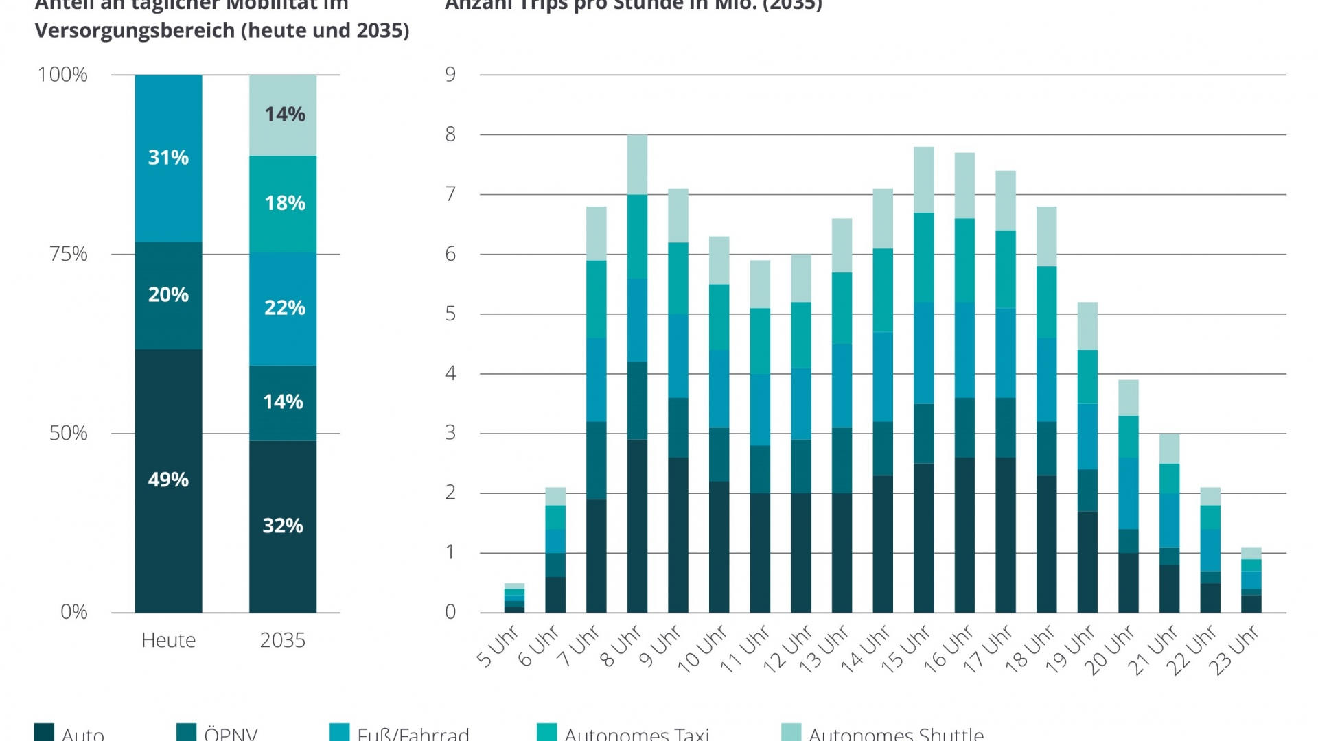Konkret bedeutet dies: Ließe man den Marktkräften freien Lauf, wären im Jahr 2035 740.000 autonome Fahrzeuge in den Städten unterwegs, das Zwölffache der heutigen Taxiflotte. Jeder dritte Weg würde somit in autonomen Fahrdiensten zurückgelegt werden. Der Preiswettbewerb würde demnach dazu führen, dass der Anteil privater Autos an den täglich gefahrenen Strecken von heute 49 auf 32 Prozent sinkt. Die Nutzung des ÖPNV geht von 20 auf 14 Prozent zurück.