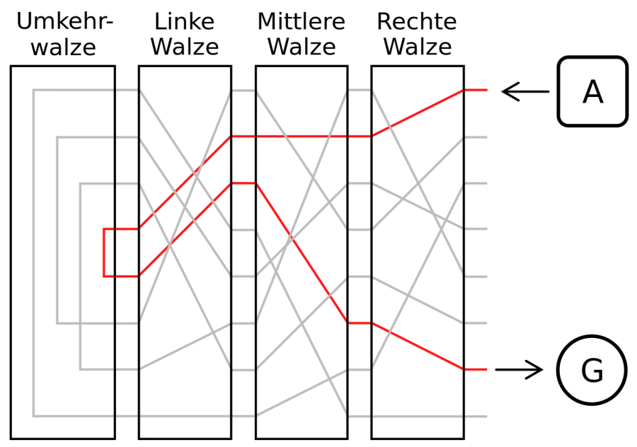 Herzstück der Enigma sind drei, später vier drehbare Walzen mit den 26 Buchstaben des Alphabets. Gibt man einen Buchstaben ein, werden die Walzen entsprechend ihrer elektrischen Verkabelung auf bestimmte Weise gegeneinander verdreht. Daraus ergibt sich der verschlüsselte Buchstabe. Da sich die Position der Walzen bei jeder Eingabe ändert, wird ein „E“ selbst innerhalb desselben Textes jedes Mal als anderer Buchstabe verschlüsselt. Um das Ganze noch komplizierter zu machen, werden die Walzen der Enigma bei jedem Einsatz in einer jeweils neuen Konfiguration in das Gehäuse eingesetzt, dadurch ändert sich die Chiffrierung ständig. Den Klartext einer mit der Enigma kodierten Nachricht bekommt man deshalb nur dann, wenn man selbst eine Enigma besitzt – und die aktuellen Konfigurationen kennt.