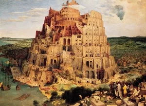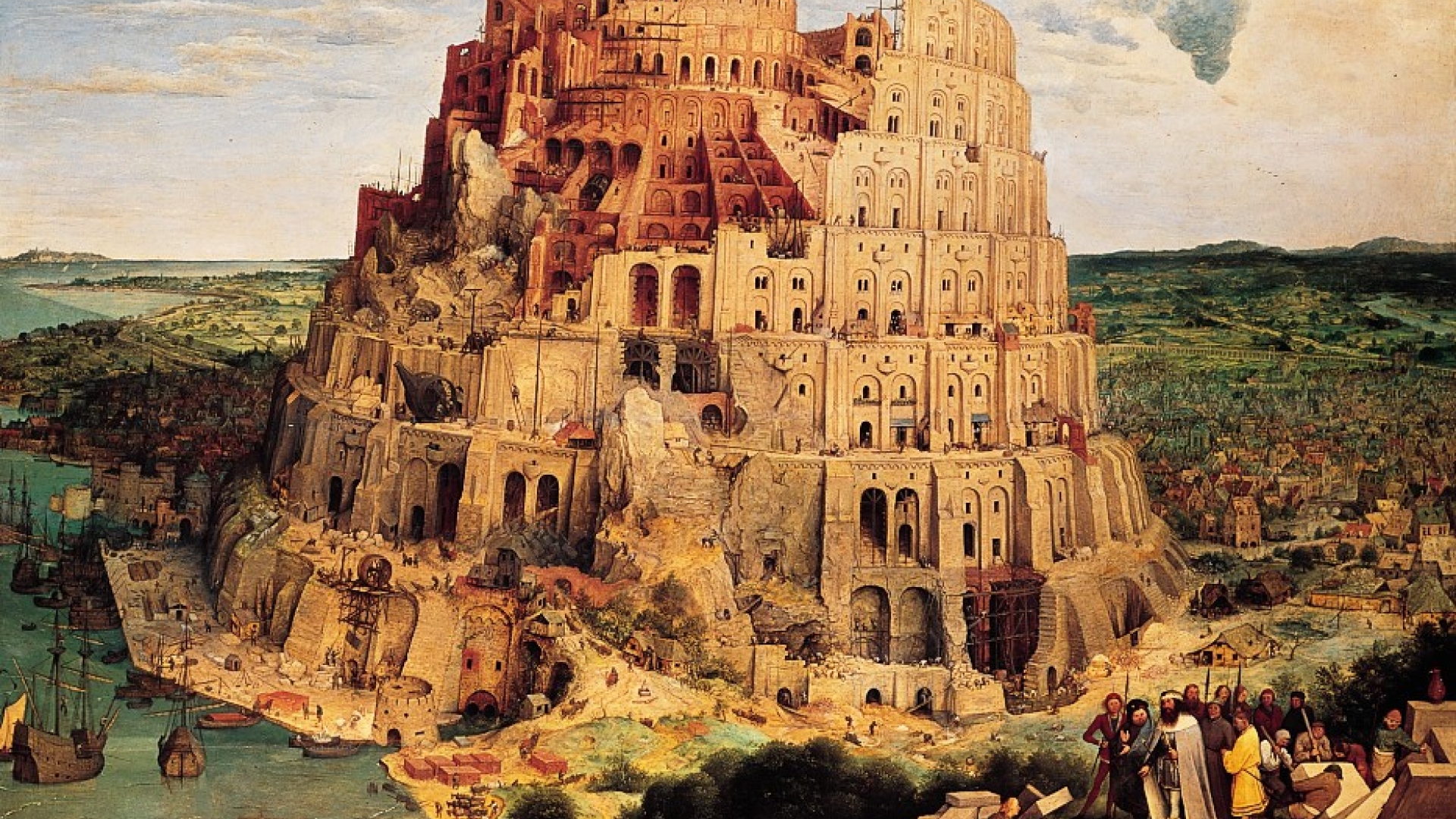 Die Menschen sprachen alle eine Sprache. Sie wollten einen Turm bauen, der bis in den Himmel reichen soll. Damit wollten sie ihre Einigkeit festigen und verhindern, dass sie in alle Welt verstreut werden. Doch mit irdischen Mitteln lässt sich der Himmel nicht erreichen. Gott bestrafte die Menschen für ihre Überheblichkeit, indem er ihnen verschiedene Sprachen gab. Die Folge: Da sich die Menschen nun nicht mehr untereinander verständigen konnten, musste der Turmbau aufgegeben werden.