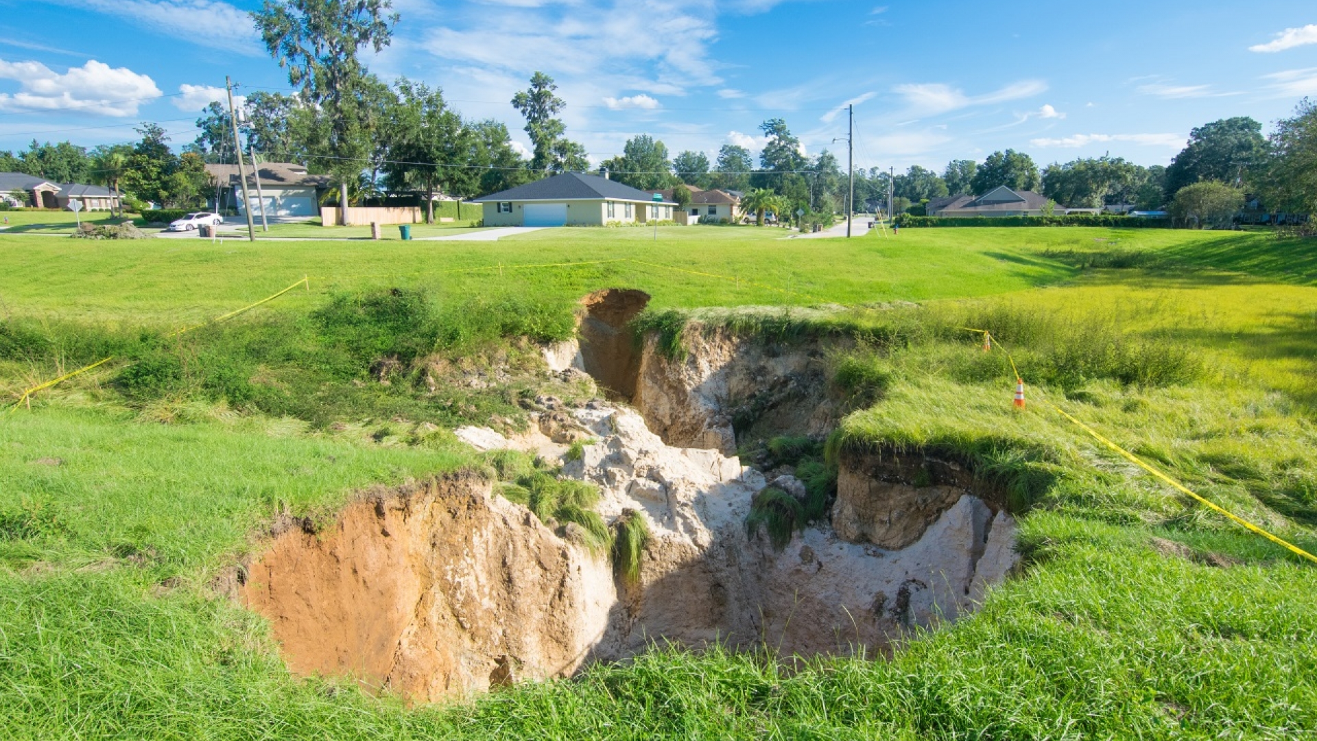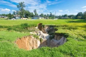 Dass solche Erdlöcher, sogenannte „Sinkholes“, entstehen, kann natürliche Ursachen haben. So zum Beispiel, wenn der Untergrund aus Gesteinen wie Kalkstein, Gips oder Salz besteht. Solche Gesteine sind anfällig für Lösungsprozesse, wie sie beispielsweise durch Sickerwasser ausgelöst werden können.