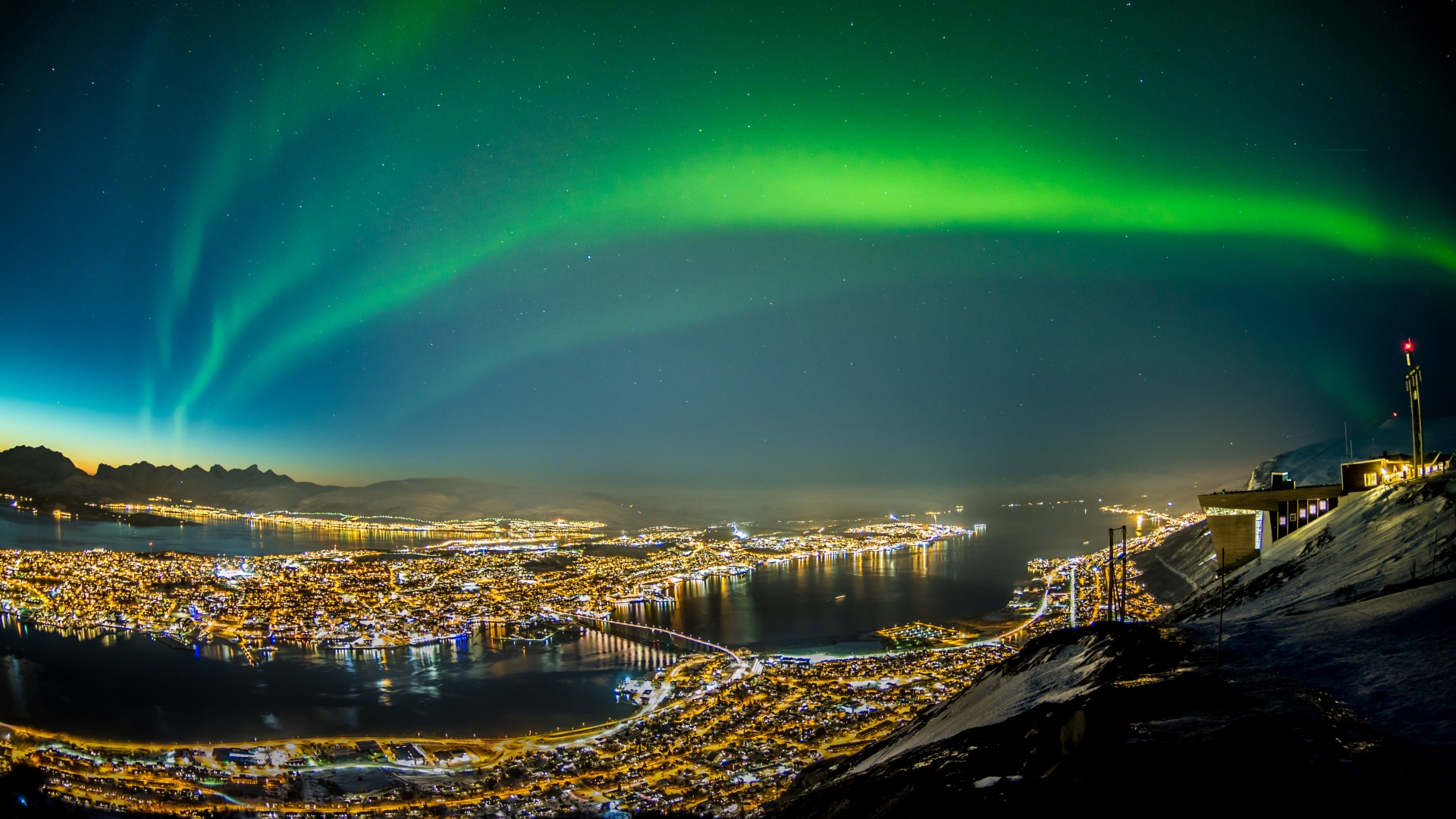 Norwegen wartet direkt mit einem zweiten Polarnacht-Reiseziel auf: Tromsø. Die Stadt liegt 320 Kilometer nördlich des Polarkreises und wird von Ende November bis Mitte Januar von der Polarnacht eingehüllt. Es ist dort allerdings nicht durchgehend stockfinster. Von 9 Uhr morgens bis 14 Uhr nachmittags herrscht ein dezentes Dämmerlicht.