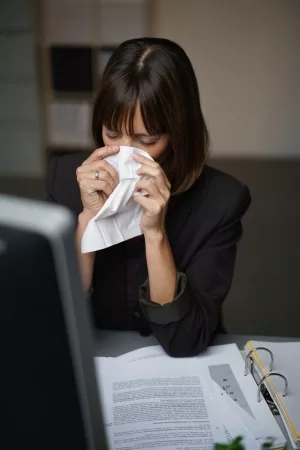 Weitere Beschwerden folgen: Der Kopf tut weh. Die Nase läuft – sofern sie kann. Ein gravierendes Problem ist auch oft die trockene Heizungs-Luft im Büro. Dann ist zwar das Problem der laufenden Nase gelöst, dafür baut sich aber dann ein Druck im Kopf auf, der jeden Moment zu explodieren droht. Auch ein trockener Mund und Husten sind eine bekannte Nebenerscheinung. Für all die Bildschirmgeplagten kommen oftmals die trockenen, roten und im schlimmsten Fall juckenden Augen hinzu.