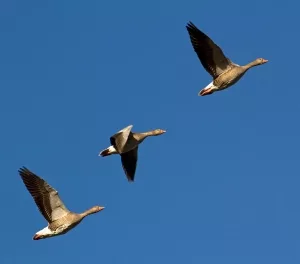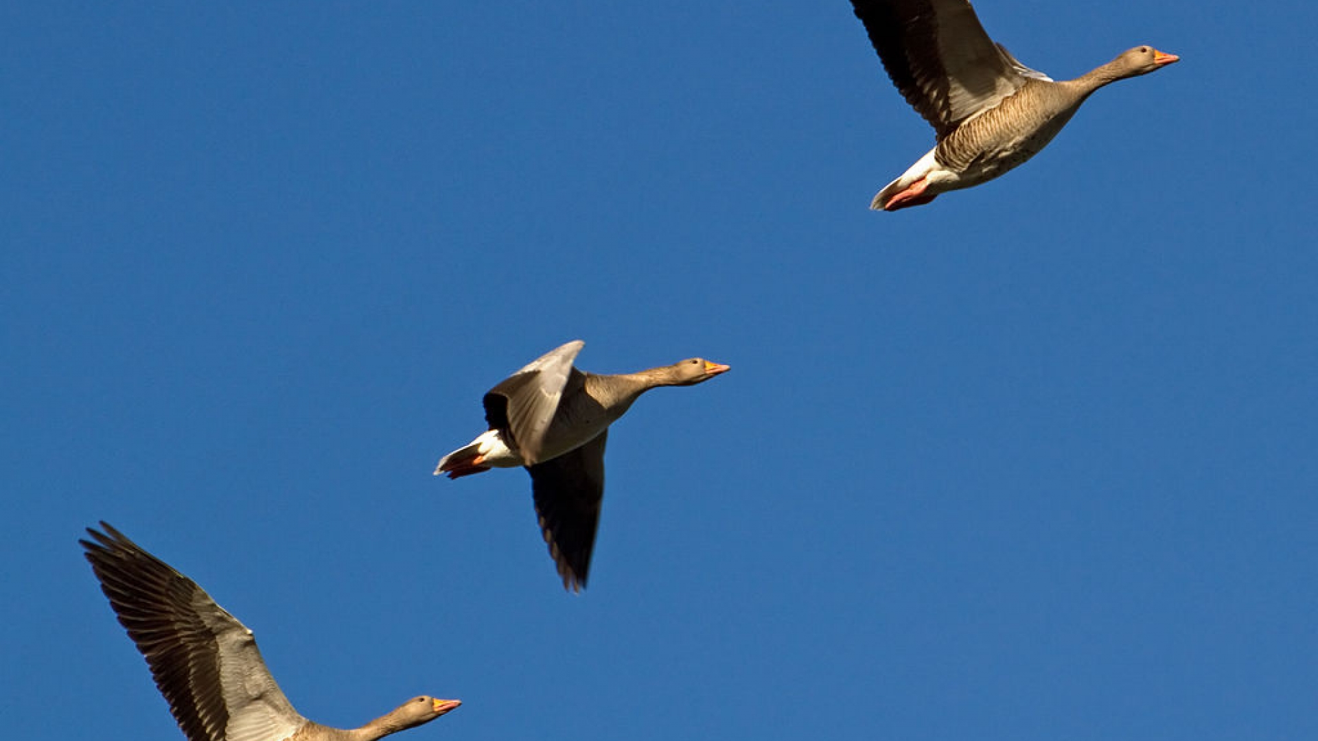 Mittel- und Kurzstreckenzieher wie Kraniche und Gänse fliegen dagegen erst sehr spät los. Sie sind vor allem im Oktober tagsüber in typischer V-Formation am Himmel zu beobachten. Dabei unterstützen sich die Vögel gegenseitig: Kraftaufwendige Flugpositionen werden regelmäßig gewechselt. Das ist clever. Wer lange vorne geflogen ist, kann an anderer Stelle weiter hinten Energie sparen und sich erholen.